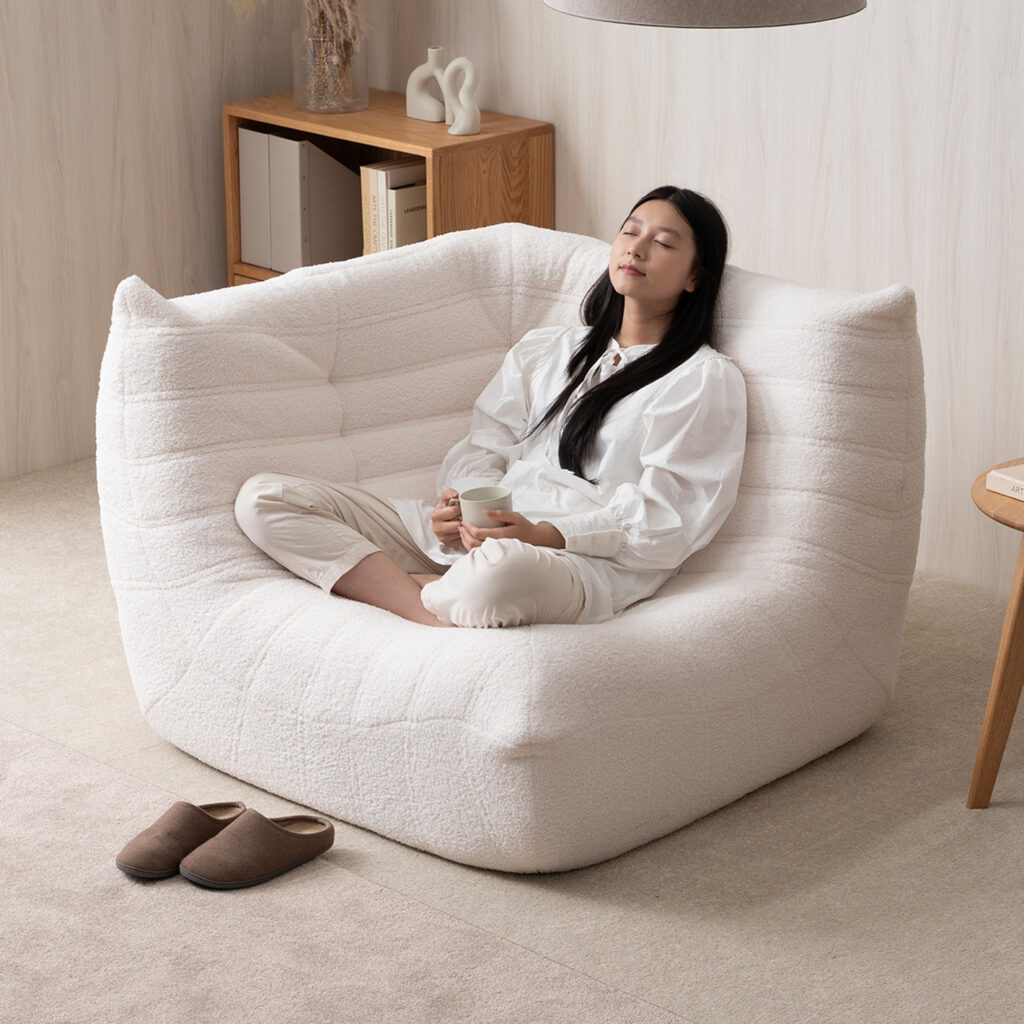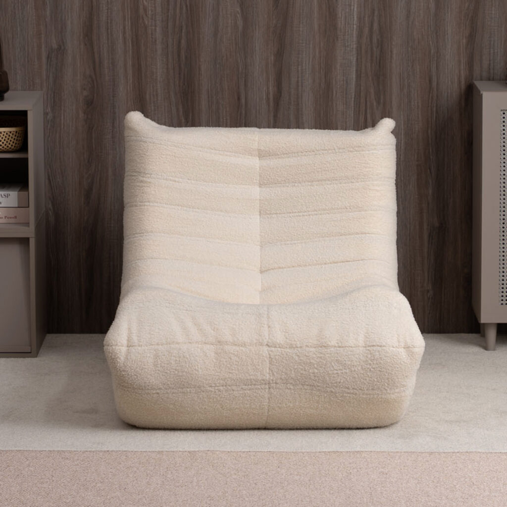 柔らかい曲線フォルムとふんわりしたシープボア調生地が心地よい、KUFUL(クフル) の1人掛けソファ。