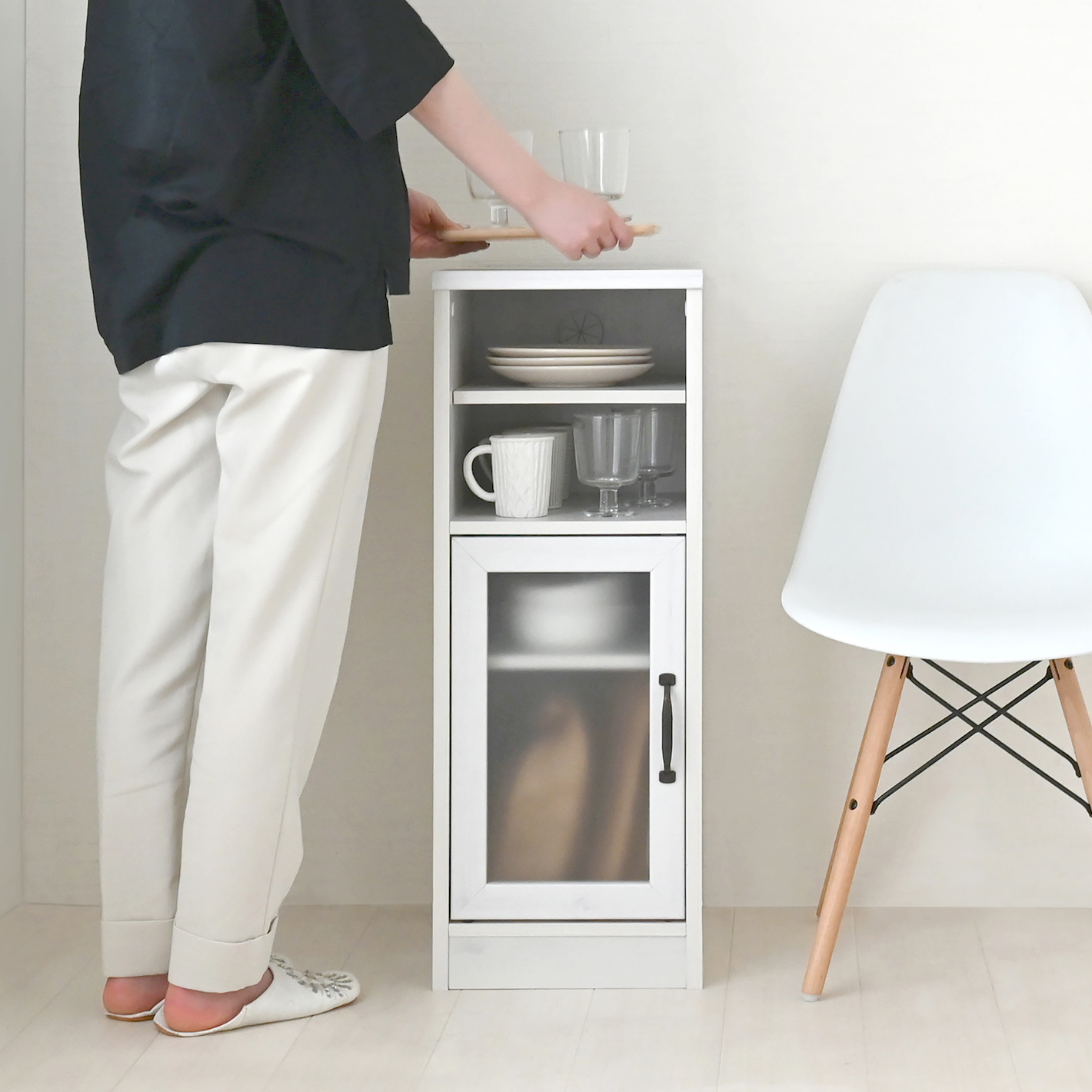 細長い形状を活かして、隙間や壁際にぴったり収まってくれるため、収納不足を効率よく補うことができます。ミストガラスの扉で、隠しすぎない収納がおしゃれな雰囲気を演出してくれます。