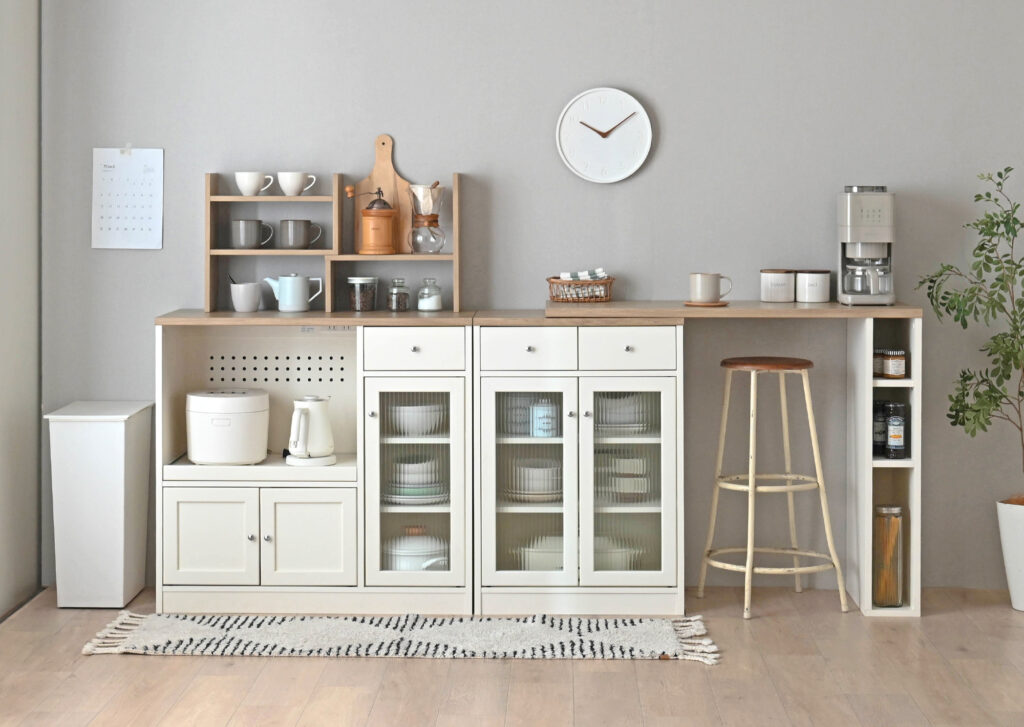 ミストガラスの扉が、生活感を程よく隠してくれる食器棚。