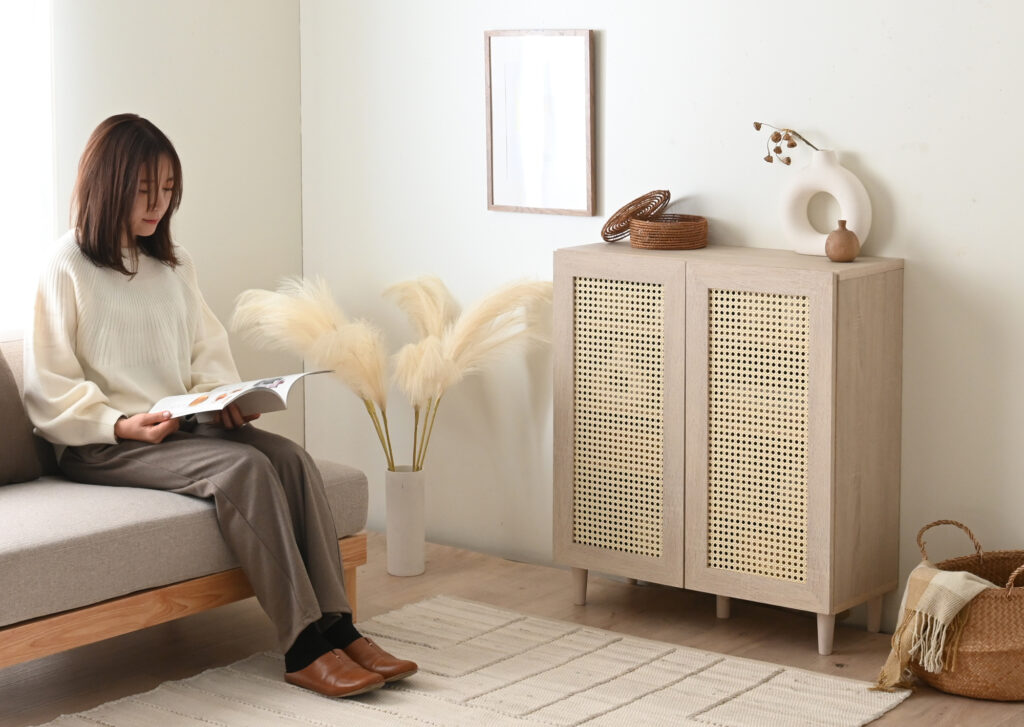ラタン素材で程よく抜け感を出しつつ、生活感をすっきる隠してくれるキャビネット。